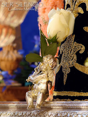 sentado sobre la peana de Nuestra Señora del Consuelo, porta